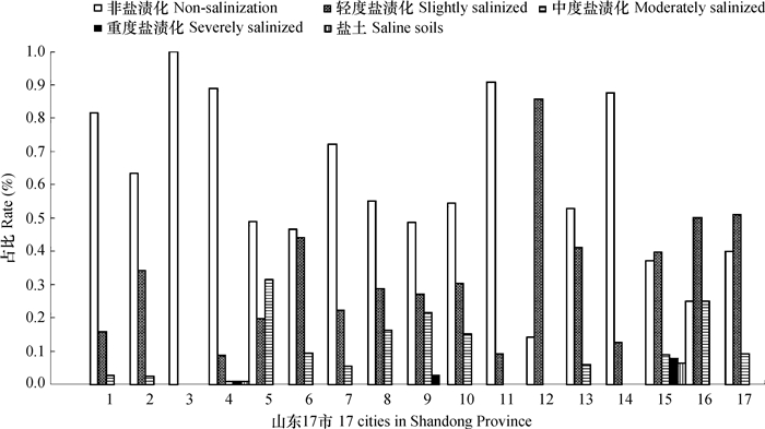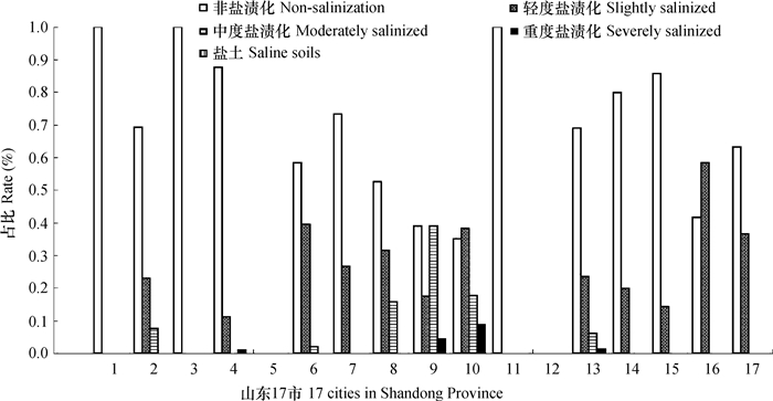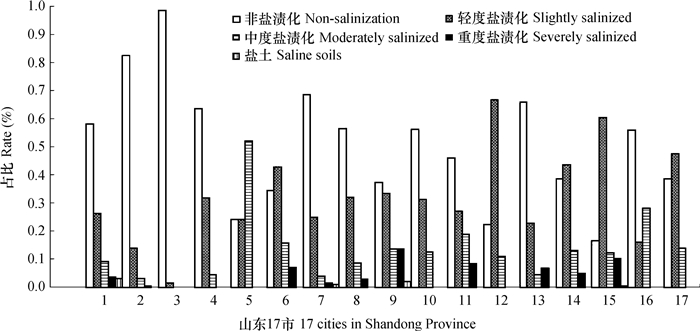 图 4 山东省各地市中小拱棚次生盐渍化状况 Fig. 4 Secondary salinization of the soils under middle and small arched shed in the 17 cities in Shandong Province |