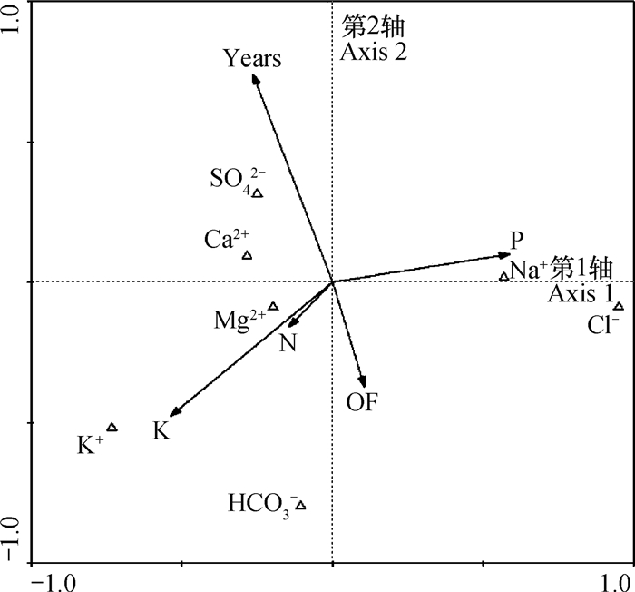 盐分离子对环境变量线段的投影点至空箭头的距离表示环境变量对盐分离子的影响,距离越短,影响越大,即在该环境变量中,盐分离子有较大的积累量。Ca2+、Mg2+与SO42-对Years(种植年限)的投影点至空心箭头的距离较近,说明2种离子的积累量随种植年限的增加而增大。K+、Na+、HCO3-、Cl-受种植年限的影响较小。N、P、K对K+、Na+、Mg2+的影响较大。