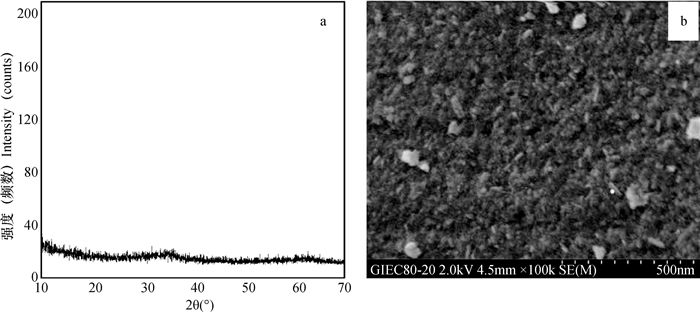 图 1 无定型氧化铁的XRD谱图(a)和透射电子显微镜扫描图(b) Fig. 1 XRD (X-ray diffractogram) pattern (a) and TEM (transmission electron microscopy) image (b) of the artificially synthesized amorphous hydrated Fe oxides