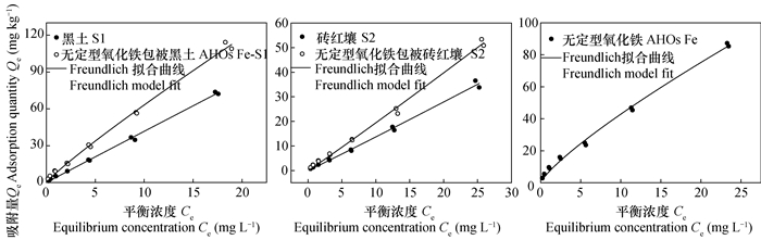 供试吸附剂对AT的等温吸附曲线如图 2所示,由图 2可知,各吸附剂对AT的吸附量均随平衡浓度的增加而增加,在实验浓度范围内,AT在各吸附剂固相上的吸附量均未达到饱和状态。采用Freundlich方程模型对AT在不同吸附剂中的吸附进行拟合,拟合参数值如表 3所示。由表 3可知,Freundlich方程能较好地拟合各吸附剂对AT的吸附作用(r≥ 0.996,p<0.01)。AHOs Fe包被后黑土和砖红壤的Freundlich拟合参数Kf值分别增加了95.4%和91.9%,然而,由于各吸附剂对AT的吸附均呈现不同程度的非线性(N<1),可见,单纯地分析Kf值并不能真实地反映各吸附剂对AT的吸附能力[15]。AHOs Fe对AT的非线性吸附最强(N=0.697),经AHOs Fe包被的黑土和砖红壤其吸附非线性程度增加(表 3)。
