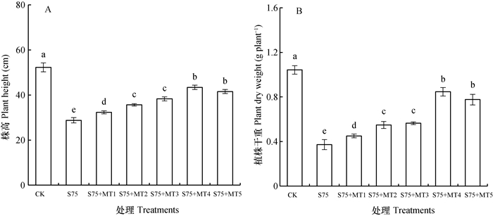 图 1 盐胁迫下不同浓度褪黑素处理对水稻幼苗株高(A)和生物量(B)的影响 Fig. 1 Effects of spraying of MT on plant height (A) and dry weight (B) of rice seedlings under salt stress relative to MT concentration 注:CK:喷施去离子水,S75:75 mmol L-1 NaCl+喷施去离子水,S75+MT1:75 mmol L-1 NaCl+喷施25 μmol L-1 MT,S75+MT2:75 mmol L-1 NaCl+喷施50 μmol L-1 MT,S75+MT3:75 mmol L-1 NaCl+喷施100 μmol L-1 MT,S75+MT4:75 mmol L-1 NaCl+喷施200 μmol L-1 MT,S75+MT5:75 mmol L-1 NaCl+喷施400 μmol L-1 MT。不同的小写字母表示处理间差异显著(p < 0.05)。下同 Note: CK: spraying ddH2O, S75: 75 mmol L-1 NaCl+spraying ddH2O, S75+MT1: spraying 75 mmol L-1 NaCl+25 μmol L-1 MT, S75+MT2: 75 mmol L-1 NaCl+50 μmol L-1 MT, S75+MT3: 75 mmol L-1 NaCl+100 μmol L-1 MT, S75+MT4: 75 mmol L-1 NaCl+200 μmol L-1 MT, S75+MT5: 75 mmol L-1 NaCl+400 μmol L-1 MT. The different lower-case letters on the columns mean significant difference at the level of 5%. The same below |