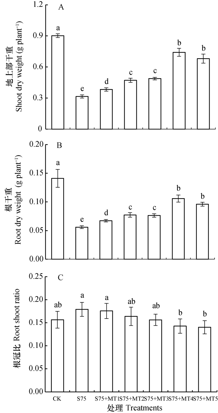 图 2 盐胁迫下不同浓度褪黑素处理对水稻幼苗地上部干重(A)、根部干重(B)和根冠比(C)的影响 Fig. 2 Effects of spraying of MT on dry weight of shoot (A) and root (B), and root shoot ratio (C) of rice seedlings under salt stress relative to MT concentration |