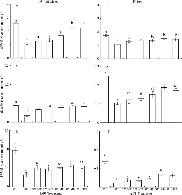图 3 盐胁迫下不同浓度褪黑素处理对水稻幼苗地上部氮(A)、磷(C)、钾(E)含量和根部氮(B)、磷(D)、钾(F)含量的影响 Fig. 3 Effects of spraying of MT on contents of N (A), P (C) and K (E) in shoot, and N (B), P (D) and K (F) in root of rice seedlings under salt stress relative to MT concentration |