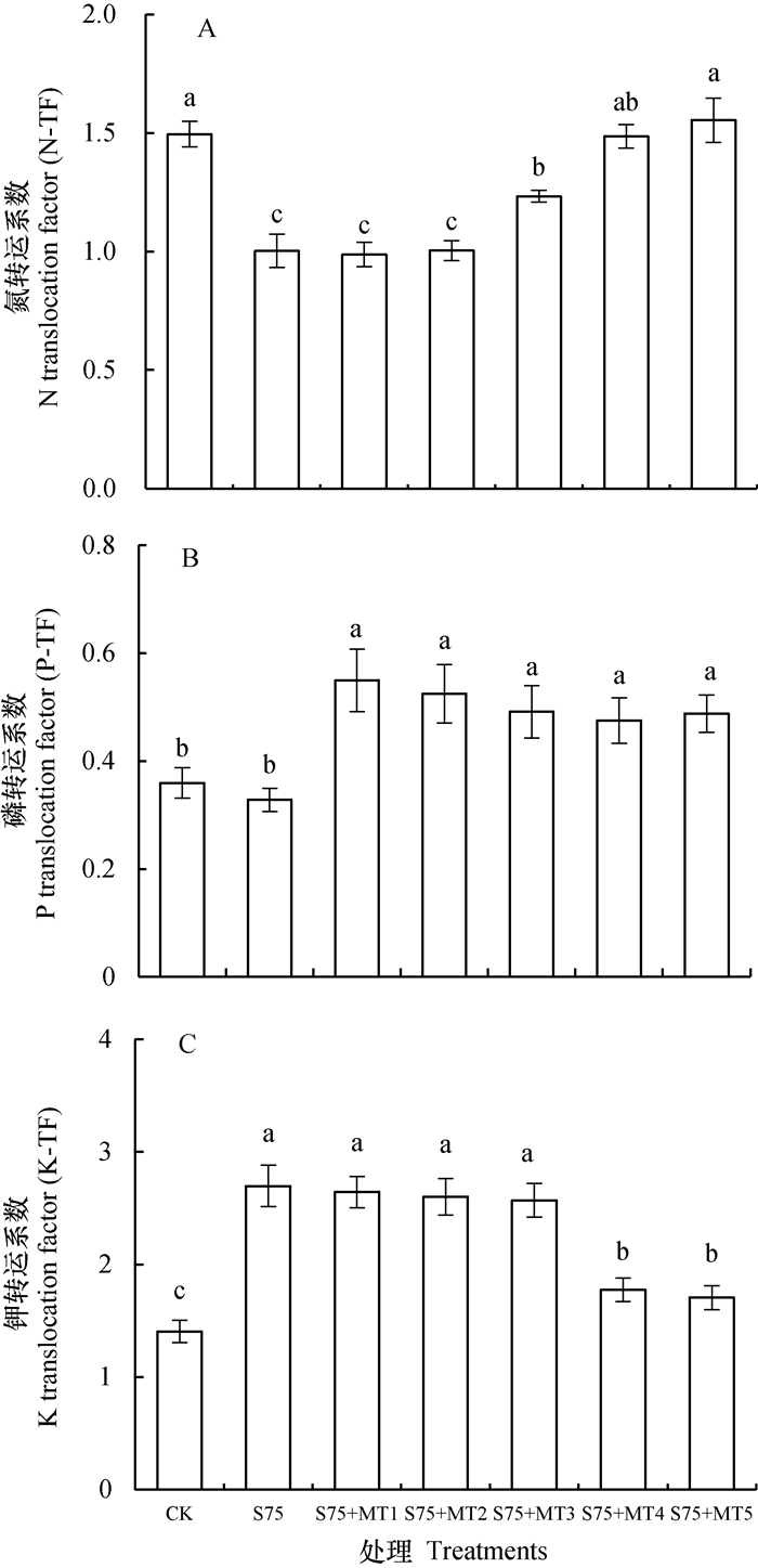 盐胁迫下,外源MT可明显提高水稻幼苗地上部和根部N、P、K含量,且随MT浓度的上升,其含量不断升高。当MT浓度达到400 μmol L-1时,不再显著升高,即从数据上看,MT浓度为200和400 μmol L-1时,植株地上部和根部N、P、K含量差异均不显著(图 3)。数据表明,75 mmol L-1 NaCl胁迫处理15 d,地上部N、P、K含量分别较对照下降57%、62%和67%,而喷施200 μmol L-1 MT时,地上部N、P、K含量分别较单独盐处理的上升103%、150%、77%(图 3A、图 3C和图 3E)。75 mmol L-1 NaCl胁迫15 d,根部N、P、K含量分别较对照下降37%、58%和83%,而喷施200 μmol L-1 MT下,地上部N、P、K含量分别较盐处理上升40%、82%、196%(图 3B、图 3D和图 3F)。与对照相比,盐胁迫下氮转运系数(N-TF)显著下降(图 4A),P-TF不受影响(图 4B),而K-TF显著上升(图 4C)。外源MT可以明显提高植株的N-TF、P-TF和K-TF(图 4)。不同的是,随着MT浓度的上升,N-TF不断上升(图 4A),P-TF无显著变化(图 4B),而K-TF起初无显著变化,MT浓度为200和400 μmol L-1时,K-TF显著下降,但仍显著高于对照(图 4C)。