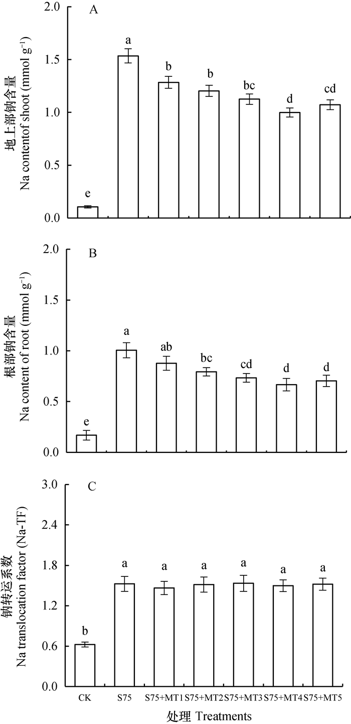 图 5 盐胁迫下不同浓度褪黑素对水稻幼苗地上部Na含量(A)、根部Na含量(B)和Na转运系数(C)的影响 Fig. 5 Effects of spraying of MT on shoot Na content (A), root Na content (B) and Na translocation factor (C) of rice seedlings under salt stress relative to MT concentration |