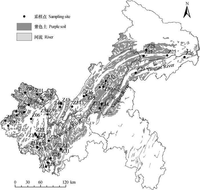 1 材料与方法 1.1 研究区概况重庆市简称渝,地处我国西南部,位于105°17′~110°11′E,28°10′~32°13′N之间,东邻湖北、湖南,南接贵州,西与四川毗邻,北连陕西,总面积8.24万km2。重庆市总体地势是西部和中部低,东北部、东南部高,由南北向长江河谷逐级降低,地貌类型多样,以山地和丘陵为主,素有“山城”之称,其中山地面积占76%,丘陵占22%,河谷平坝仅占2%;全市大致可分为渝西方山丘陵区、中部平行岭谷区(低山、丘陵区)、渝东北中山区和渝东南中山区等4个地貌分区。全市均属亚热带湿润季风气候区,具有夏热冬暖、光热同季、湿润多阴、无霜期长、立体气候显著等特点;全市年均气温16~18℃,长江河谷的巴南、綦江、云阳等地可达18.5℃以上,东南部的黔江、酉阳等地14~16℃,东北部海拔较高的城口仅13.7℃;年均降水量较丰富,大部分地区在1000~1 350 mm;年均相对湿度多在70%~80%,在全国属高湿区;年日照时数1 000~1 400 h,日照百分率仅为25%~35%,为全国年日照最少的地区之一。重庆市属沉积岩广泛发育区域,境内中生代地层出露面积甚大;紫色土是境内分布面积最广的土类(图 1),占全市土地面积的33.22%,其成土母岩主要为中生代三叠系、侏罗系和白垩系等地层的紫色沉积岩,主要分布在渝西方山丘陵区和中部平行岭谷区,且大多位于海拔800 m以下,仅有少量散布在渝东北和渝东南中山区。