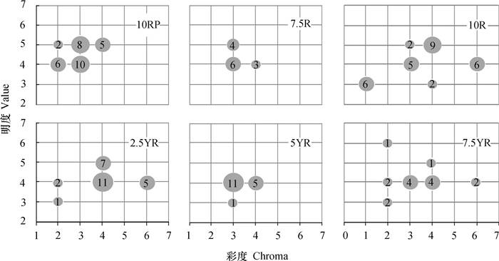 土壤颜色是反映土壤形态的一个重要指标,从表 2可知,供试剖面的土壤色调(干/润态)有10RP、7.5R、10R、2.5YR、5YR、7.5YR和2.5Y等,符合上述色调的剖面数由多到少依次为10个(10RP)、9个(10R)、7个(2.5YR)、5个(5YR)、5个(7.5YR)、4个(7.5R)和1个(2.5Y),仅有不到总样点数1/4的紫色土剖面满足紫色砂、页岩岩性特征的色调要求“2.5RP~10RP”;受成土母岩—黄色砂岩的色调影响,Z06剖面的土壤色调(2.5Y)较其他剖面更黄;从图 2可知,供试剖面发生层土壤颜色(润态)的主要色调及明度、彩度范围分别为:10RP(4~5)/(2~4)、7.5R(4~5)/(3~4)、10R(3~5)/(1~6)、2.5YR(3~5)/(2~6)、5YR(3~4)/(3~4)和7.5YR(3~6)/(2~6)。供试紫色土母岩颜色(润态)的色调及具有相同母岩色调的剖面数分别为10RP(11个)、2.5YR(10个)、10R(9个)、7.5R(4个)、5YR(4个)、7.5YR(2个)和2.5Y(1个),其主要色调及明度、彩度分布见图 3;绝大多数剖面发生层土壤的色调与母岩一致,仅有少数剖面(4个)受成土环境的影响,土体色调与母岩有异,如剖面Z02的母岩色调虽为10RP,但由于受地形影响,其R层以上土体内易形成滞水和侧渗,引发土体内铁素还原淋失,使其色调变化明显(表 2)。