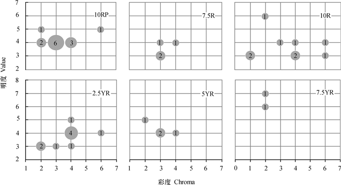 图 2 供试剖面发生层土壤颜色(润态)的主要色调及明度、彩度分布 Fig. 2 Main hue, value and chroma of soil color (wet) for different horizons in the tested profiles 注:位于灰色圆点上的数字为样本数。下同 Note: Numbers on gray dots are sample sizes. The same below |