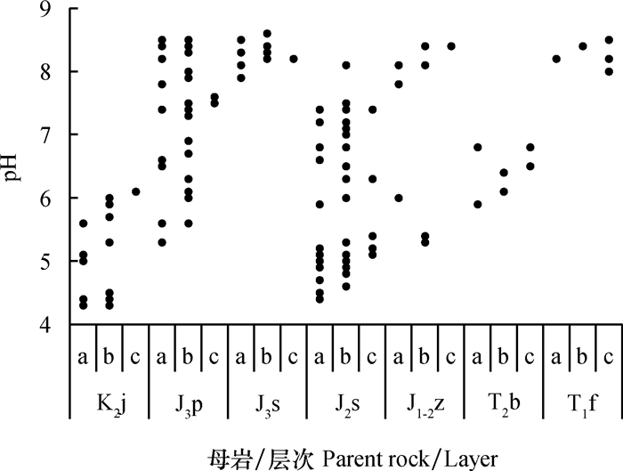 图 4 不同母岩发育的紫色土发生层pH值分布 Fig. 4 pH values of soil horizons for purple soils developed from different parent rocks 注:a表示表土层(A层);b表示中部土层(B层或AC层);c表示B层或AC层以下发生层 Note: The letter a represents the topsoil layer (A horizon); the letter b represents the middle soil layer (B horizon or AC horizon); the letter c represents the soil layer under B horizon or AC horizon |