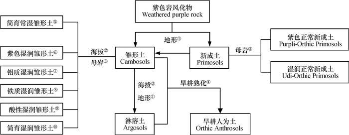 综合上述因素的相关影响分析,本文对地形、海拔、母岩、人为活动等因素在重庆市紫色岩风化物发育土壤(紫色土)类型演变及划分过程中发挥的作用进行了简要归纳,具体见图 5。