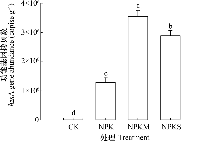 图 1 长期不同施肥土壤厌氧氨氧化菌hzsA基因丰度 Fig. 1 hzsA gene abundance in paddy soils under long-term fertilization relative to formula of the fertilization (n=3) |