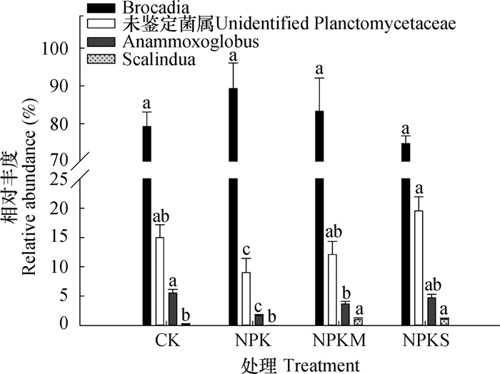 图 2 长期不同施肥土壤厌氧氨氧化菌相对丰度 Fig. 2 Relative abundance of anammox bacteria in paddy soils under long-term fertilization relative to formula of the fertilization 注:不同字母表示同一个属不同处理间具有显著性差异 Note: Different letters indicate significant difference between treatments the same in genera |