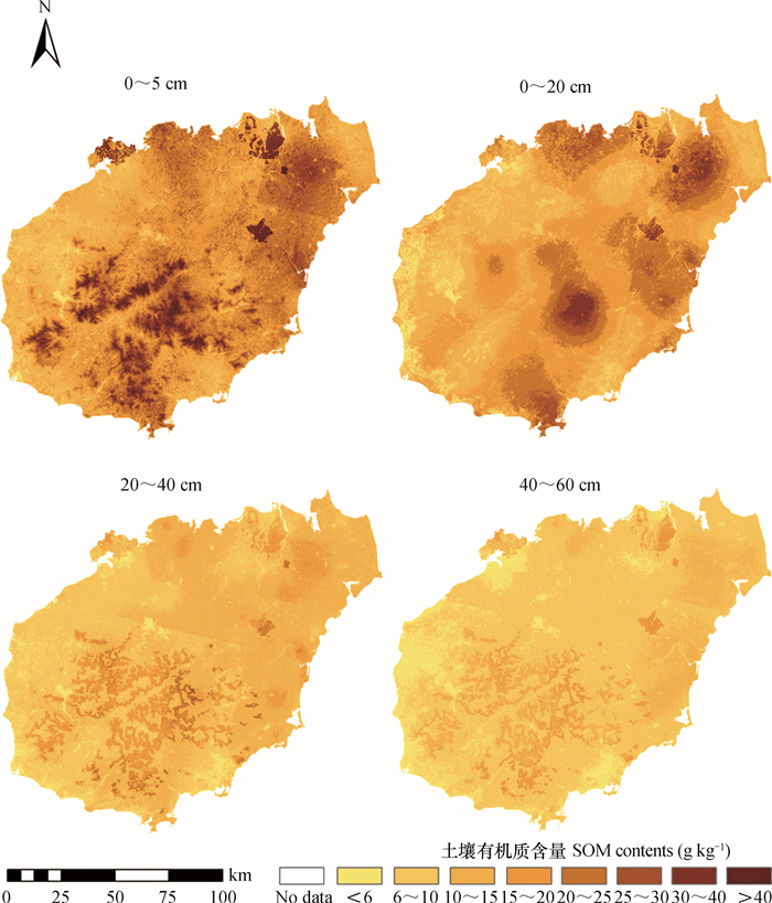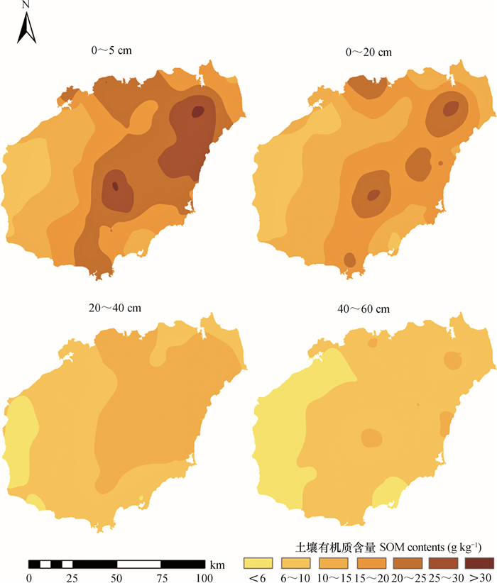 图 2可知,0~5 cm土层SOM含量共分为6个等级,按占全岛面积的比例进行排序如下:20~25(32.63%) > 15~20(25.83%) > 10~15(19.36%) > 25~30(12.99%) > 6~10(8.74%) > 30~40 g kg-1(0.45%),SOM含量 > 10 g kg-1的等级占全岛面积的91.26%。其中高值(25~30、30~40 g kg-1)主要分布在岛内东北的琼山南部、文昌西南部、定安东部、琼海北部地区和岛中部的琼中地区,低值(6~10 g kg-1)分布在岛西部和西南部的昌江、东方沿海一带。整体而言,该岛SOM含量呈现出西部地区低于东部地区的空间分布趋势,这与前人[19-20]的研究结果相一致。0~20 cm土层SOM含量的空间变异规律与表层相似,但SOM含量等级数减少,> 10 g kg-1等级的土壤面积占全岛的84.53%,其中10~15 g kg-1和15~20 g kg-1等级所占比例相当,二者共占全岛面积的70.98%。20~40 cm土层 > 10 g kg-1等级的土壤面积占全岛的44.54%。而40~60 cm土层SOM含量 > 10 g kg-1等级的土壤面积仅占全岛的2.85%,该土层主要分布在6~10 g kg-1范围内,占全岛面积的72.12%。