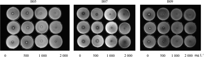 蒸汽灭菌(121℃,1.5大气压,30 min,下同)固体培养基。由于1000mgL-1ERC显著抑制蚕豆、莴苣和白菜等幼苗生长[8-9],故当培养基冷却至45~50℃时,加入ERC使其浓度分别达到0(对照)、500(低)、1000(中)和2000(高)mg L-1,相当于含小檗碱0、7.31、14.62和29.24 mg L-1。取10ml培养基于60 mm培养皿中,冷却后在中央分别接种0.1 ml B05、B07和B09菌液,25±1℃暗培养7 d,测量菌落和透明圈直径,计算溶磷指数[15]: