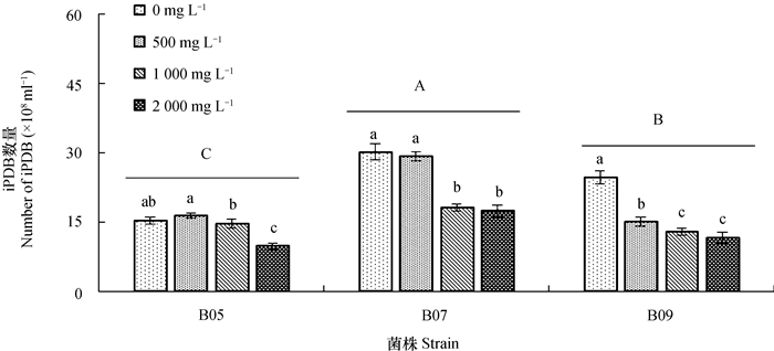 图 2 在不同浓度的ERC培养液中iPDB的数量变化 Fig. 2 Variation of the population of iPDB in the liquid culture medium relative to ERC concentration 注:不同大、小写字母分别表示菌株间和处理间差异显著(p≤0.05) Note: Different capital and lowercase letters indicate significant difference betweenbacterial strains and treatmentsat 0.05 level, respectively |
