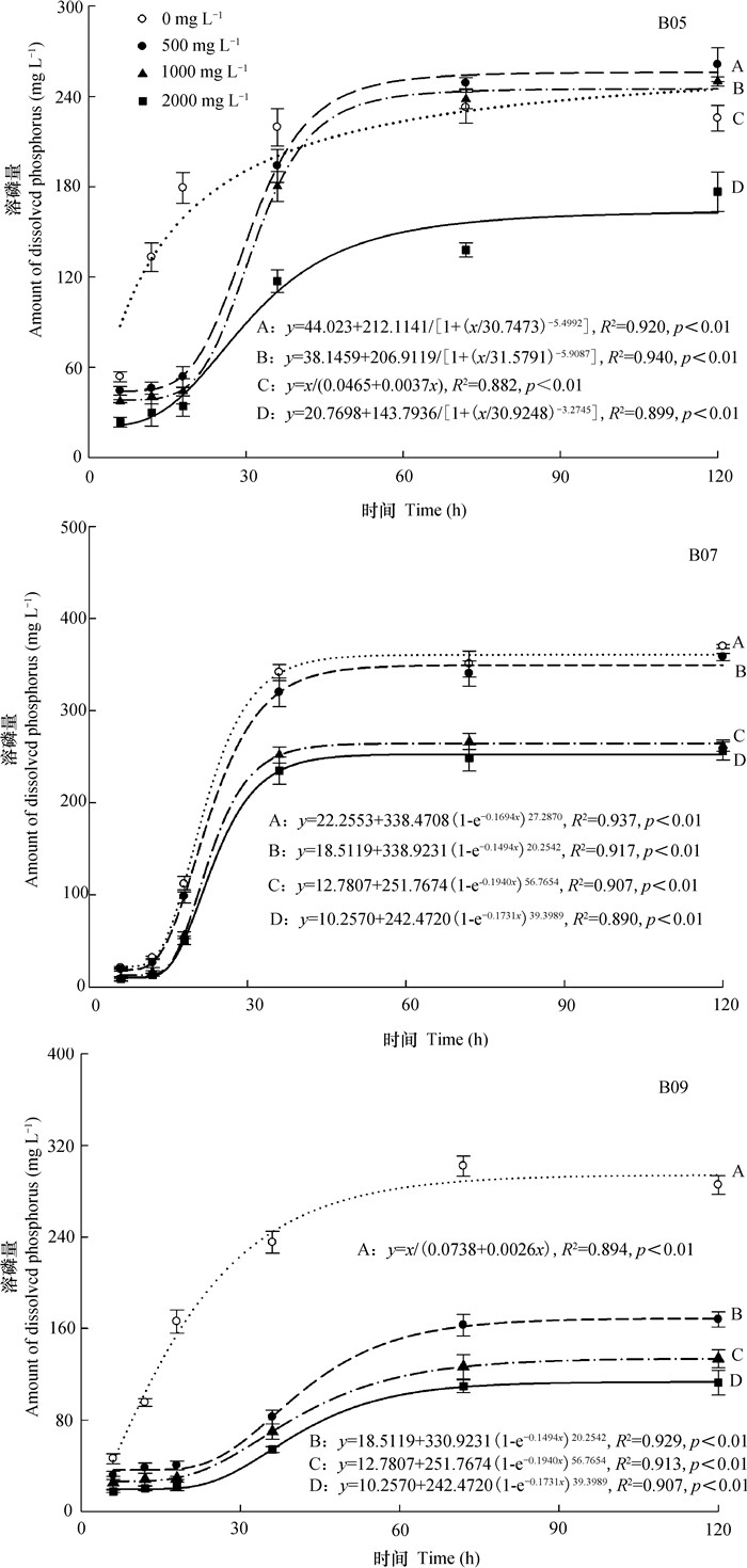 2.3 ERC对iPDB溶磷量的影响图 3可见,iPDB菌株不同,在培养液中的溶磷量也不一样,平均值(mg L-1)分别为228.31±18.76(B05)、311.64±30.40(B07)和174.89±38.61(B09)。B05和B09的溶磷量(y)与培养时间(x)的关系可用y=x/(a+bx)描述,B07则可用y=y0+a(1-e-bx)c反应。随ERC浓度提高,B07和B09的溶磷量显著降低。对B05而言,高浓度ERC抑制溶磷;培养时间≥72 h,低、中浓度ERC处理的溶磷量与对照无显著差异。
