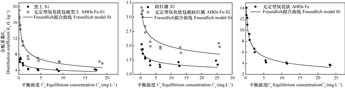 不同体系和平衡浓度下,AT在固-液两相中的分配系数Kd值如图 3所示。由图 3可知,黑土和砖红壤的固-液体系中,Kd均随平衡浓度的增加而逐渐降低,当平衡浓度为2.5 mg L-1时Kd趋于近似恒定。AHOs Fe包被后的黑土和砖红壤,其Kd降低的趋势比较明显,达到恒定状态的平衡液中AT浓度水平稍有增加。AHOs Fe的固-液体系中,Kd随平衡浓度的增加迅速降低,但下降程度逐渐减缓,当平衡浓度为5 mg L-1时Kd达到基本恒定。可见,各吸附剂对AT的吸附在低平衡浓度时表现为非线性吸附,而到达一定浓度后则表现为线性吸附。Chiou等[16]研究表明,线性吸附可采用分配系数Kd来比较各吸附剂对污染物的吸附能力,为此,本文计算了在近似恒定平衡浓度点的Kd平均值(表 3)。由表 3可知,各吸附剂对AT的吸附分配系数Kd值大小顺序为:AHOs Fe-S1>S1>AHOs Fe>AHOs Fe-S2>S2。AHOs Fe包被黑土和砖红壤,其Kd值分别增加了56.3 %和43.8 %。