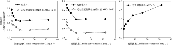 3.2 无定型氧化铁对阿特拉津的解吸迟滞效应目前,关于引起有机污染物在吸附剂中解吸迟滞效应的作用机制主要有以下几个方面:1)化学键形成或在特定吸附点位的不可逆结合;2)慢解吸速率;3)吸附质被吸附剂分子捕获,如被无机组分的中孔隙、微孔隙或有机质捕获等;4)结构或空隙变形机制[30-31]。如Laird等[30]的研究表明,AT与土壤中的黏土矿物间的化学键合作用是引起AT在土壤中解吸迟滞效应的主要因素。Weber等[31]研究表明,吸附质不可逆地吸附在矿物的特殊位点上,并且由于矿物的表面存在微孔导致慢解吸速率,从而引起解吸滞后。Xia和Pignatello[32]的研究表明,高浓度范围时,土壤微孔或结构变形程度增加,引起土壤对丁草胺的解吸迟滞效应增强。本研究中不同平衡浓度时土壤对AT的解吸迟滞效应不同(图 4)。在低浓度时,随浓度升高,AT在固-液两相中的分配比例逐渐降低(图 3),土壤中AHOs Fe表面有机质的分配吸附贡献较大,AT先占据高能吸附位点,随着吸附量的增加,高能点位越来越少,低能点位吸附的AT比例越来越大,故越容易被解吸,即迟滞效应逐渐降低(HI变小);而在高浓度范围内,固液两相中溶质的浓度梯度较大,促使较多的溶质分子进入有机-无机复合体中的有机质矩阵或空隙的内部,进入有机质微孔领域的溶质分子可以和有机质(SOM)形成氢键,从而使迟滞效应略有增强。黑土的吸附能力大于砖红壤,但其对AT的解吸迟滞效应却明显弱于砖红壤(表 3,图 4),可见,在AT土壤环境风险评价时,不但要考虑土壤的吸附能力,还需考虑所吸附AT的可解吸程度。