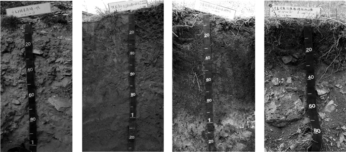2 结果 2.1 供试土壤的剖面形态特征供试土壤剖面各层次色调相同,明度、彩度略有差异,从表层到底层土壤颜色逐渐变浅。从土壤形成环境来看,发育于贺兰山山地的供试土壤海拔高度均低于发育于六盘山山地的土壤剖面(表 1)。海拔条件影响土壤腐殖质的积累程度[21]。总体而言,发育在贺兰山山地的供试剖面土壤颜色较浅、以棕色为主,其中发育在海拔1 650 m的滚钟口景区的典型土壤其腐殖质积累量大于另外4个剖面,腐殖质层颜色较深呈现暗棕色;而发育在六盘山山地的剖面较贺兰山山地的剖面土壤颜色深,以暗棕色为主,其中发育在海拔高度2 460 m的120号剖面腐殖质层深厚,约95 cm,剖面颜色呈现黑棕色。
