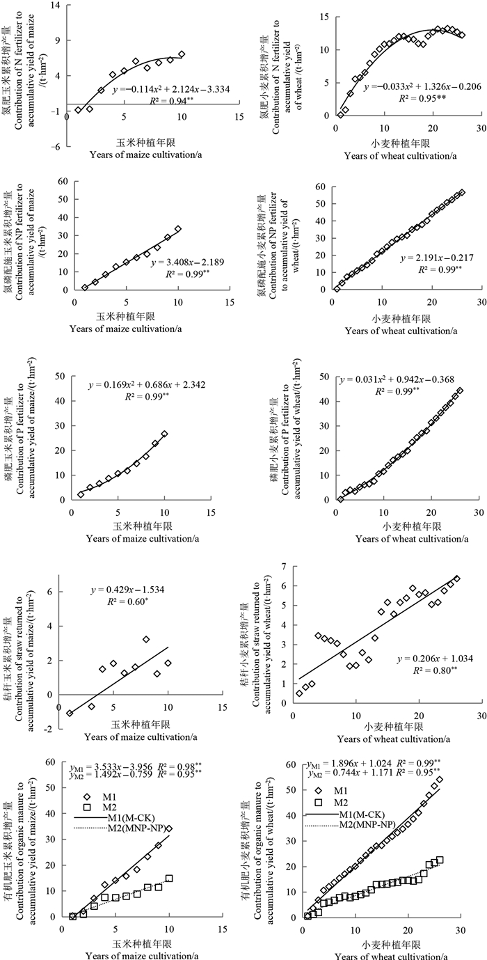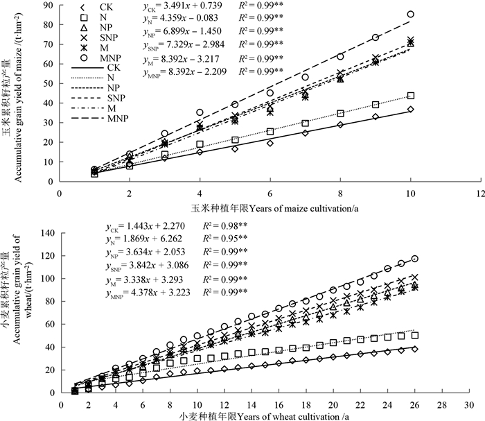 3 讨论 3.1 作物累积产量及肥料的作物产量贡献作物产量的施肥响应是评价施肥措施是否科学的主要依据,但由于受气候和品种等因素的影响,年际间作物产量通常有较大波动。为消除气候、品种等所引起的产量波动,多采用滑动平均、相对产量等方法处理[13]。本研究发现,CK和N处理小麦累积产量随试验年限延长增速逐减,而其他处理则直线增加;N肥的小麦和玉米累积产量贡献量随种植年限的增加先增加后降低,而NP、秸秆和有机肥的累积产量贡献量随试验年限线性增加,与累积产量变化趋势相互印证;CK、N、NP、SNP、M、MNP 6处理玉米和小麦的多年平均籽粒产量与由拟合方程所得的相应处理年均产量相近,以上结果均表明采用累积产量法可在更长的时间尺度上消除年际间作物产量的波动,通过建立不同施肥处理种植年限与累积产量的数学关系,可准确确定不同施肥及肥料作物产量演变趋势特征和贡献量等参数。