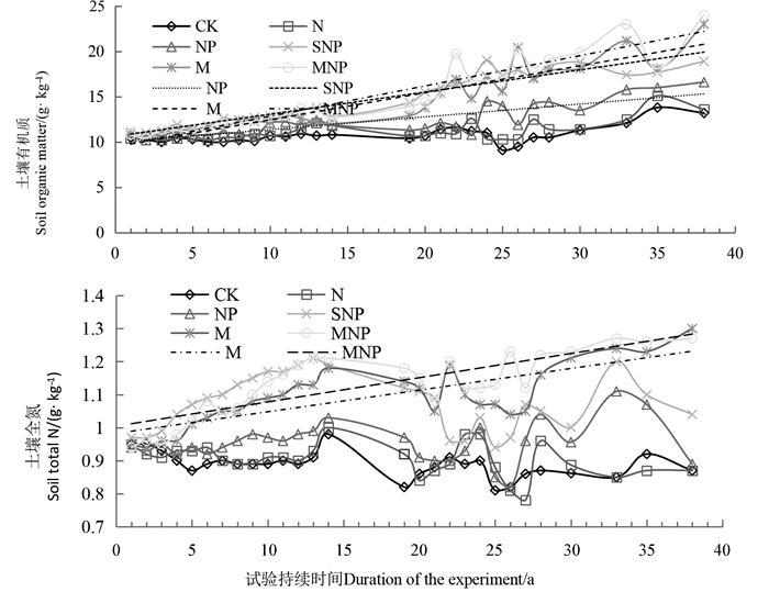 2.3 施肥对土壤肥力的贡献 2.3.1 施肥对土壤有机质和全氮的贡献由图 3可以看出,随试验年限延长,施有机肥及秸秆还田土壤有机质含量明显增加,不施肥(CK)和仅施用化肥(N,NP)处理土壤有机质含量也有所增加。除CK和N处理,其余处理土壤有机质含量与试验年限显著正相关(yNP = 0.18x + 9.69,R2 = 0.71**;ySNP = 0.32x + 10.09,R2 = 0.92**;yM = 0.39x + 8.95,R2 = 0.84**;yMNP = 0.44x + 8.86,R2 = 0.87**)。2015年CK、N、NP、SNP、M和MNP土壤有机质含量分别为13.2、13.6、16.6、18.9、23.4和24.2 g·kg-1,分别较1978年增加22.8%、26.5%、54.4%、75.8%、114.0%和123.3%,年均增速分别为0.064、0.075、0.154、0.214、0.322和0.348 g·kg-1。2015年NP、SNP、M和MNP处理土壤有机质含量显著高于对照(CK)和仅施氮肥(N)处理,其分别较对照增加25.7%、43.2%、74.2%和81.8%。M和MNP处理显著高于NP和SNP处理,但CK与N、NP与SNP及M与MNP处理间差异不显著(表 2)。