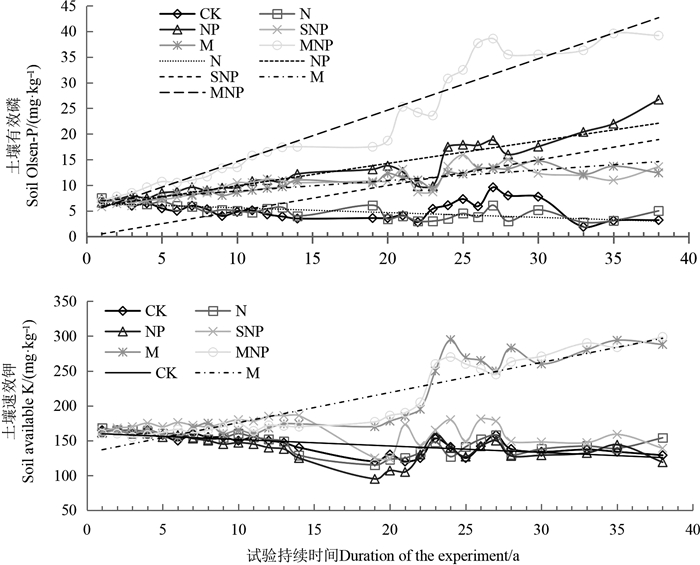 2.3.2 施肥对土壤有效磷和速效钾的贡献CK和N处理长期不施磷,土壤有效磷(Olsen-P)含量随试验年限延长而逐渐降低,而NP、SNP、M和MNP处理每年均有磷输入,土壤有效磷含量均随试验年限延长而逐渐增加(图 4),且与试验年限显著正相关(yN = -0.13x+6.78, R2 = 0.53**; yNP = 0.57x+4.70, R2 = 0.82**; ySNP = 0.28x+6.38, R2 = 0.69**; yM = 0.278x + 6.27, R2 = 0.88**; yMNP = 1.33x + 2.36, R2 = 0.94**)。2015年CK、N、NP、SNP、M和MNP的有效磷含量分别为3.2、5.0、26.7、13.6、12.4和39.2 mg·kg-1,与1978年初始值相比,CK和N处理降低了52.7%和26.1%,年均减少0.094 mg·kg-1和0.047 mg·kg-1,而NP、SNP、M和MNP处理较对照分别增加了394.4%、100.9%、83.2%和479.0%,年均增加0.52、0.18、0.15和0.85 mg·kg-1。2015年NP、SNP、M和MNP土壤有效磷含量显著高于对照,分别较对照增加638%、325%、288%和1125%。MNP既施有机肥又施磷肥,年均土壤磷素投入量最大(153 kg·hm-2),土壤有效磷含量也显著高于其他处理;其次为NP处理,NP处理(30 kg·hm-2)虽年均土壤磷素输入量低于M处理(120 kg·hm-2),但有效磷含量高,因而,NP处理土壤有效磷含量也显著高于M处理;SNP处理磷素输入量低于NP处理,但因施用化学磷肥,土壤有效磷含量虽显著低于NP处理,但与M处理差异不显著(表 2)。