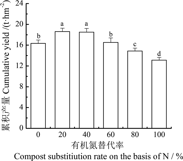利用水生植物净化富营养化水体是一种解决水体污染的有效途径,然而水生植物残体再利用障碍已成为该技术推广难题之一。本研究利用伊乐藻堆肥与化学氮肥配施,探索水生植物源有机肥高效利用模式,为水生植物残体资源化利用提供理论依据和技术支撑。本文连续4 a研究结果表明:水生植物源有机氮替代率为20%和40%时,小麦累积产量较单施化学氮肥提高了14.0%和13.5%(P < 0.05)。有机氮替代率60%下小麦累积产量则与单施化肥处理相当;当有机氮替代率进一步提高时,小麦产量则显著降低(图 1)。且有机氮不同替代率下的小麦产量差异随着试验年份的累积而逐渐缩小(图 2)。国内外关于有机肥适宜替代率的研究结果并不相同,但多数研究者认为有机肥所占比例并非越高越好,而是存在最佳比例,这与本文植物源有机肥试验结果基本表现一致。如邢鹏飞等[16]在华北农田棕壤4 a试验结果表明,猪粪有机肥替代率为30%,连续4 a小麦产量均与单施化肥相当,有机肥替代率为50%,两年小麦产量出现降低。吕凤莲等[17]在陕西关中塿土2 a试验结果表明,小麦产量随着有机肥替代率的增加表现为先增后降的趋势,但是当有机肥替代率在75%时,小麦产量最高。侯红乾等[18]在湖南红壤双季稻系统25 a试验表明,30%有机肥替代下开始即能迅速增产,但增产趋势随时间的延续先增加再减小,70%有机肥替代处理一开始增产幅度较小,甚至低于化肥处理,但随着时间的延续增产幅度明显增加。然而,在环太湖地区稻田配施水生植物有机肥研究表明,试验第1年仅单施有机肥下水稻产量显著低于单施化肥,有机氮其他替代率下水稻产量均未受影响;连续施用4 a后全量有机肥下水稻产量也与单施化肥处理相当[13]。研究结果的差异不仅是土壤基础肥力水平和试验持续时间差异性造成,还与试验地点的气候等环境因素相关[17]。有机肥自身的速效养分含量有限,需要通过微生物矿化分解来释放养分,而土壤水分和温度等环境因素又直接影响微生物的生物量和活力等[19]。环太湖地区是水稻高产区,小麦种植季气候、温度和水分等完全不同于水稻季,可能引起了有机肥中速效养分释放较慢,加剧微生物与作物竞争速效养分,进而影响产量[13, 19-20]。水生植物有机肥与化肥不同配比下,肥料及土壤养分释放规律与环境水热因素的相关性今后需进一步研究。