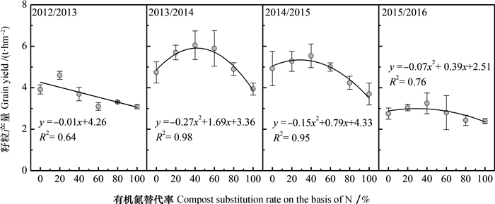 图 2 各年份有机肥和尿素不同配施比例与小麦籽粒产量的关系 Fig. 2 Relationships between wheat grain yield of the experiment and compost substitution rate relative to year |