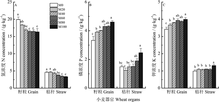 注:不同小写字母表示相同部位不同处理间差异显著(P < 0.05)。下同 Note: Different lowercases indicate significant difference between treatments (P < 0.05) of the same organ. The same below 图 3 有机氮不同替代率下小麦籽粒和秸秆氮磷钾浓度(2014—2016) Fig. 3 NPK concentration in wheat grain and straw relative to compost substitution rate (2014-2016) |