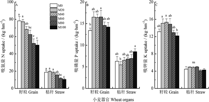 成熟期籽粒吸氮量随着有机氮替代率的增加而下降:当有机氮替代率大于等于60%时,籽粒氮吸收量下降了20.2%~35.8%(P < 0.05),秸秆吸氮量降低了16.7%~43.8%(P < 0.05,图 4A)。小麦籽粒磷、钾吸收量基本随着有机氮替代率的增加呈先增后降的趋势;与单施化肥相比,单施有机肥显著提高秸秆吸磷量,秸秆吸钾量各处理间无显著差异(图 4B和图 4C)。