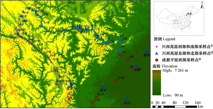 ① Sampling sites in the western and southern parts of the West Sichuan Plateau ②Sampling sites in the eastern and northern parts of the West Sichuan Plateau ③ Sampling sites in the western part of the Chengdu Plain 图 1 川西表土样点分布图 Fig. 1 Distribution of the topsoil sampling sites in West Sichuan |