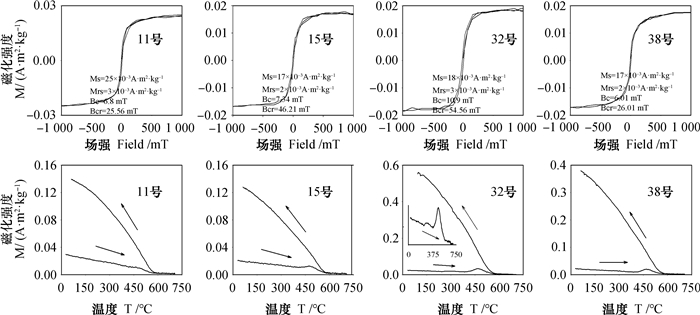 2.3 磁滞回线和热磁曲线磁滞回线能够很好地指示样品中磁性矿物的类型和畴态特点[27-28]。图 2中样品的磁滞回线均经过了顺磁校正,从图可知川西表土的大部分磁滞回线变化基本一致,总体形态呈现高而瘦,与黄土高原相似,表明大部分样品主要以低矫顽力的亚铁磁性矿物为主。15号和32号样品中的磁滞回线在300 mT左右形成闭合,表明样品中含有高比例的低矫顽力亚铁磁性矿物;11号和38号样品在500 mT没有闭合,指示了样品中含有较多的高矫顽力磁性矿物。磁性矿物在加热过程中表现出不同的磁性特征,因此利用热磁曲线可以分析样品中所含磁性矿物的种类[27-29]。从整体上看,所有的样品中的热磁曲线加热到580 ℃附近,磁化强度迅速下降,表明样品中以磁铁矿为主,并且样品的加热曲线在冷却曲线的下方,指示了在加热过程中产生大量的强磁性矿物。其中样品的热磁曲线的磁化强度在500 ℃左右出现明显的峰值,这与黄土高原黄土的热磁曲线一致,指示了样品中含铁硅酸盐矿物或弱磁性矿物在加热过程中转化为磁铁矿[30]。大部分样品的磁化强度在300~450 ℃间有明显的减少,这可能是亚稳定、强磁性的磁赤铁矿受热转化成热稳定的、弱磁性的赤铁矿(γ-Fe2O3→α-Fe2O3)造成的[31]。此外,32号样品在300 ℃左右出现了峰值,指示了加热过程中铁的氢氧化物(如纤铁矿)脱水生成了少量磁赤铁矿(γ-FeOOH→γ-Fe2O3)[32],表明了川西表土可能存在土壤季节性湿润的现象导致成土环境转变为相对还原环境的现象。