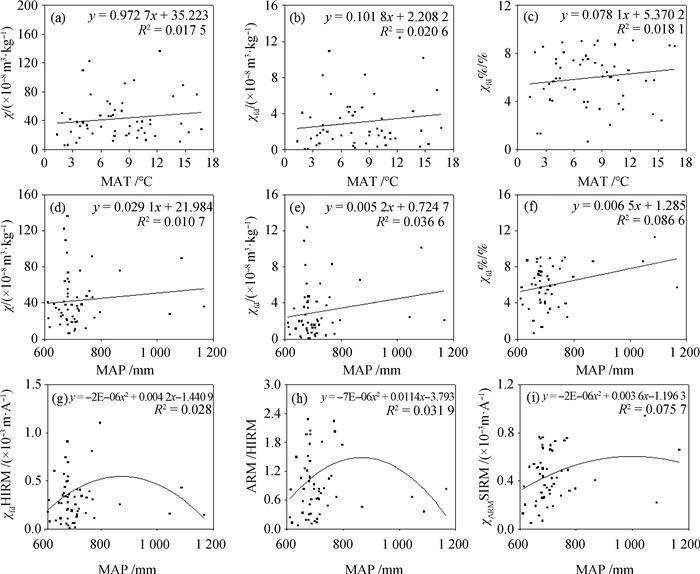 图 4 磁学参数与环境参数的相关性 Fig. 4 Diagram of the relationships between magnetic parameters and environmental parameters |