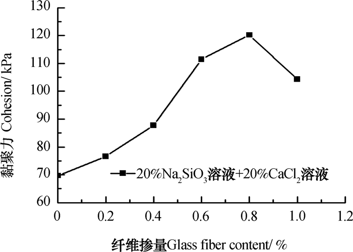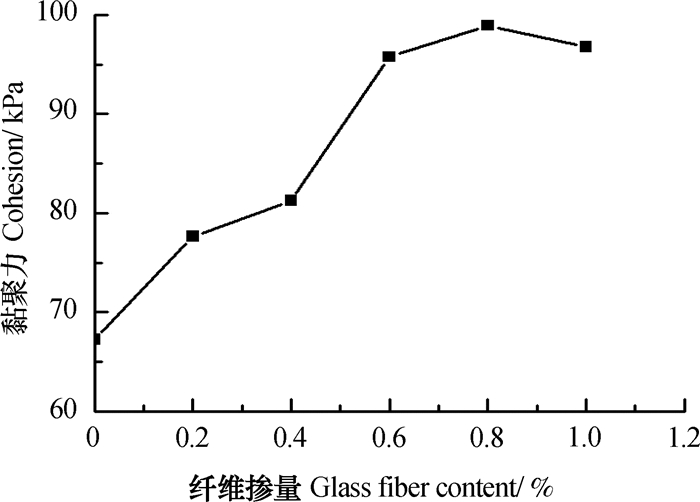 图 3 纤维掺量对黏聚力的影响 Fig. 3 Effect of addition rate of the fiber on cohesion |