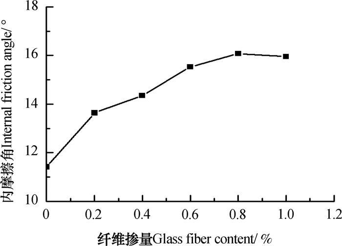 图 4 纤维掺量对内摩擦角的影响 Fig. 4 Effect of addition rate of the fiber on internal friction angle |