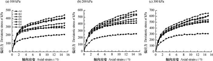 养护结束后, 将土分五层倒入制样器内, 用压实装置将土制成50 mm×100 mm的试样。各组试样的初始含水率均为18%, 干密度为1.60 g·cm-3, 每组三个试样。各组试样的处理参数如表 3所示。制完试样后, 用保鲜膜将试样包裹, 装入密封袋, 放入保湿缸, 在室内室温条件下养护7d。养护完成后, 采用GDS饱和土三轴仪对其进行不固结不排水剪切, 试验围压为100 kPa、200 kPa、300 kPa。剪切速率为0.828 mm·min-1, 破坏标准按照峰值强度或15%轴向应变确定[7]。
