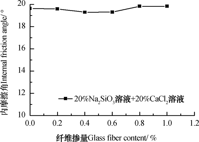 从图 3中可以看出, 在控制干密度、含水率及在不加入Na2SiO3溶液和CaCl2溶液的条件下, 随着玻璃纤维百分含量的增加, 黏聚力一直在增长, 相比于素土组A0, 纤维土的黏聚力均大于素土, 纤维掺量为0.8%时, 纤维土黏聚力达到最大, 相比于素土, 黏聚力提高了47.06%。由图 4中可知, 随着纤维百分含量的增加, 内摩擦角φ不断增大, 当掺量为0.8%时, 内摩擦角达到最大, 当掺量超过0.8%后, 内摩擦角变化不明显。
