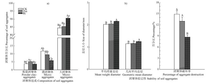 2 结果 2.1 AM真菌侵染率、团聚体粒级分布和稳定性接种AM真菌47 d后,桑树根系镜检可观察到菌丝和泡囊结构,说明AM真菌已成功侵染。其中Fm处理的侵染率(47.53%)显著高于Ri(43.10%),且两者均显著提高桑树的株高和地径(表 1)。图 1a显示,Ri处理大团聚体含量显著增加(增幅为7.20%),Fm和Ri微团聚体含量均显著降低(降幅分别为19.1%和50.4%),Ri的效应更为明显。然而,Fm显著增加 < 0.053 mm粒级团聚体含量(36.4%),而Ri对此没有显著影响。综合而言,各处理不同粒级团聚体的比例由高至低依次为大团聚体、微团聚体、粉黏团聚体,而接种R. intraradices的团聚效应明显优于接种F. mosseae。图 1b发现,与CK对比,接种F. mosseae对MWD、GMD和PAD影响不明显,但接种R. intraradices显著增加MWD和GMD、显著降低PAD。