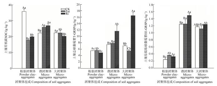 图 2显示,Fm和Ri处理显著增加微团聚体SOC含量,但降低其他粒级SOC含量。与CK相比,Fm显著降低大团聚体T-GRSP含量,对其他粒级影响不显著; 而Ri显著增加大团聚体和微团聚体T-GRSP含量,显著降低粉黏团聚体T-GRSP含量。同一处理各粒级间T-GRSP含量差异显著,其中CK和Fm微团聚体中最高,而Ri表现为大团聚体中最高。接种F. mosseae和R. intraradices显著增加粉黏团聚体EE-GRSP含量,但接种R. intraradices对大团聚体和微团聚体EE-GRSP含量的影响显著大于接种F. mosseae。同一处理均表现为微团聚体中EE-GRSP含量最高,而粉黏团聚体中最低。表 2显示,Fm和Ri对土壤有机碳的效应为负,尤其Ri达-9.17%。土壤T-GRSP的占比在25.5%~76.5%之间,土壤EE-GRSP的占比在4.87%~5.93%之间,并且Ri均高于Fm。