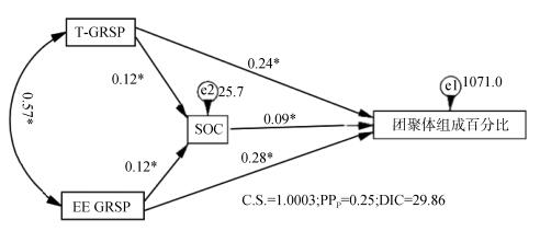 由图 3中聚敛统计量C.S. < 1.002、事后预测p值PPp介于0.05~0.95之间、差异信息准则DIC > 10,说明模型为适配模型。根据标准化路径系数可知,T-GRSP、EE-GRSP和SOC对各粒径组成表现为正向显著影响。效应分析结果表明(表 3),各影响因子总效应表现为EE-GRSP > T-GRSP > SOC,因而EE-GRSP是影响团聚体组成的主要驱动因子。