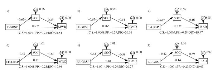 注:a-c分别为T-GRSP与SOC对土壤团聚体MWD、GMD和PAD影响; d-f分别为EE-GRSP与SOC对土壤团聚体MWD、GMD和PAD影响。 Note:a-c:Effects of T-GRSP and SOC on MWD, GMD and PAD, respectively; and d-f:Effects of EE-GRSP and SOC on MWD, GMD and PAD, respectively. 图 4 GRSP、SOC对团聚体稳定性影响的结构方程模型 Fig. 4 SEM showing effects of GRSP and SOC on soil aggregate stability |