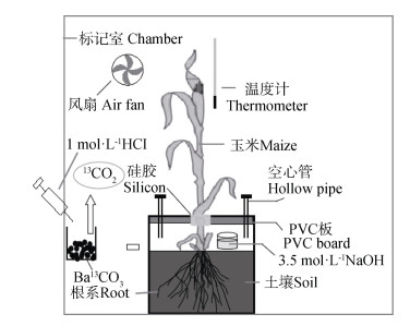 分别在玉米出苗后29 d(拔节期)、57 d(抽穗期)和72 d(灌浆期)进行标记。每次选取3盆玉米,放入透明塑料制成的密闭标记室进行13CO2脉冲标记[15,18](图 1)。(1)标记前,连接CO2吸收装置,让标记过程中根际呼吸产生的13CO2汇聚在盆内;(2)将盆内土壤和隔板间的空气与标记室空气隔开,隔板和PVC柱的接合处用凡士林密封,并在玉米基部与隔板的间隙中涂上凡士林密封;(3)检查密闭性:将气球套在一空心管上,在另一端管口用吸耳球鼓气,根据气球膨胀状态判定密封性好坏,然后将空心管管口堵住;(4)将风扇、玉米植株和13C丰度为98%的Ba13CO3放入标记室内,然后将整个标记室密封;(5)标记于上午09:00点开始,用注射器向装有Ba13CO3的烧杯中注入一定量1 mol·L-1的HCl溶液(根据Ba13CO3计算HCl的用量),然后开始标记。此后每隔一段时间,根据CO2检测仪的读数确定是否加入盐酸,当CO2的浓度低于200×10-6时,向烧杯中注入HCl,维持CO2浓度在360×10-6左右,标记时间持续7 h。