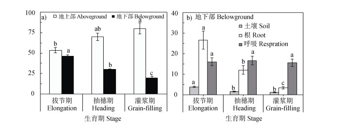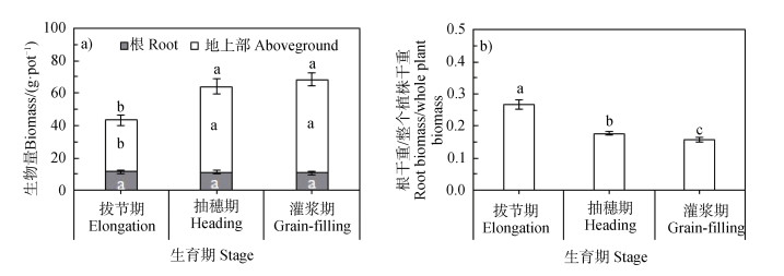 2 结果 2.1 不同生育期玉米生物量变化玉米从拔节到灌浆期,根系生物量无显著变化,而地上部和整个植株生物量在抽穗期达到最大,然后维持不变(图 2a)。从拔节期到灌浆期,根系生物量/整个植株生物量的比值显著递减(图 2b)。