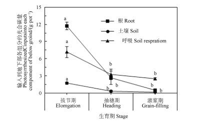 在玉米关键生育期进行13C脉冲标记,地上部保留了大部分的光合13C,并且随着玉米生长,地上部的13C分配比例显著增加,而输入到地下部的13C分配比例显著递减(图 3)。从拔节期到灌浆期,玉米地上部输入到地下部各组分(根系、根际沉积碳和根源呼吸)的光合碳量呈递减趋势,拔节期的各组分碳输入显著高于后两个生育期,后两个生育期之间无显著差异(图 4)。