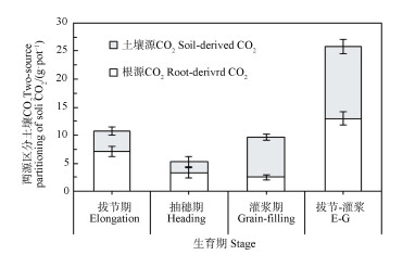 注:E-G代表从拔节期到灌浆期,下同。 Note:E-G stands for growth stage from elongation to grain-filling,the same below. 图 5 利用13CO2脉冲标记两源区分玉米根际CO2释放 Fig. 5 Two-source partitioning of CO2 emission from maize rhizosphere with the aid of 13CO2 pulse labeling technique |