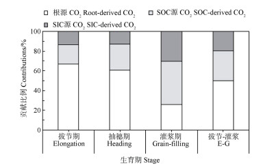 在两源法区分根际CO2的基础上(图 5),借助13C三元混合模型(13C自然丰度法),将土壤源CO2进一步拆分为SOC和SIC源CO2(图 6),发现SOC和SIC源CO2占土壤CO2的贡献比例在灌浆期较高(SIC和SOC源的贡献比例分别为44.1%和30.1%),在前两个生育期较小(SIC和SOC源的平均比例分别为23.1%和13.2%)。从拔节期到灌浆期,SOC和SIC源的累计CO2占根际CO2排放的贡献比例约为30%和20%。