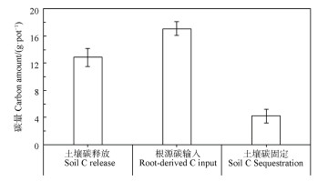 从拔节期到生育期末,玉米生长对土壤转移的光合碳量为17.1 g·pot-1(根系+根际沉积物),土壤本身碳(SOC+SIC)释放碳量为12.9 g·pot-1,因此土壤净固定碳量为4.2 g·pot-1(土壤光合碳输入量减去土壤本身碳释放;图 7)。