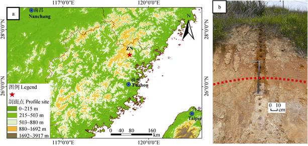 图 1 周宁黄红壤剖面地理位置示意图(a)和剖面照片(b),图b中的红色虚线为B层与C层分界线 Fig. 1 Location of Profile ZN of yellow-red soil(a)and photo of the profile(b), red dotted line is the boundary of horizon B and C |