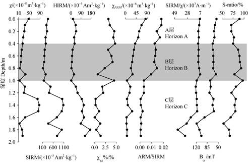2 结果 2.1 常温磁学特征ZN剖面各层次磁学参数的深度变化曲线如图 2所示。该剖面整体磁化率(χ)偏低,介于12.92×10–8~86.67×10–8 m3·kg–1,表明亚铁磁性矿物含量较少。随着深度减小磁化率呈先降低而后升高,可能是因为颗粒较粗的原生强磁性矿物磁铁矿在成土过程中被破坏而使磁化率降低;同时,在成土作用下,含铁硅酸盐矿物(如角闪石、辉石、黑云母)中铁的释放,细粒强磁性矿物的生成使得土壤磁性增强。饱和等温剩磁(SIRM)介于126.80×10–5~1 074.38× 10–5 Am2·kg–1。硬剩磁(HIRM)介于2.41×10–5~171.53×10–5 Am2·kg–1,随着深度增加HIRM增大,表明剖面下部含有相对较多的硬磁性矿物。百分比频率磁化率(χfd%)用于指示超顺磁(SP)颗粒的相对含量,其值均小于5%,A层和B层的χfd%远高于C层,表明A层和B层含有少量SP颗粒,而C层基本没有SP颗粒。指示单畴(SD)颗粒绝对含量的非磁滞磁化率(χARM)随深度增加而减小,A层χARM高于B层和C层,表明剖面上部含有较多的SD颗粒,成土作用使磁颗粒变细。ARM/SIRM随深度的变化曲线与χARM一致。SIRM/χ不仅与磁性矿物类型有关,还受磁颗粒大小影响,A层和B层SIRM/χ低于C层,表明剖面上部SP颗粒含量相对较高,下部多畴(MD)颗粒含量相对较高,随着深度增加SIRM/χ增大,进一步表明剖面下部含有相对较多的反铁磁性矿物。剩磁矫顽力(Bcr)可用于区分磁性矿物类型,呈现与SIRM/χ相似的变化趋势。S-ratio指示软、硬磁性矿物的比重大小[22-23],ZN剖面S-ratio均值为78.48%,C层S-ratio低于A层和B层,表明该剖面以亚铁磁性矿物为主,C层反铁磁性矿物含量相对较高。剖面各层次具有显著的磁学特征差异。