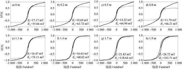 图 3 周宁剖面代表性样品磁滞回线(实线:未进行顺磁校正的磁滞回线,虚线:顺磁校正后的磁滞回线) Fig. 3 Magnetic hysteresis loops of representative samples collected from Profile ZN(Solid line: hysteresis loop without paramagnetic correction, and dashed line: hysteresis loop after paramagnetic correction) |